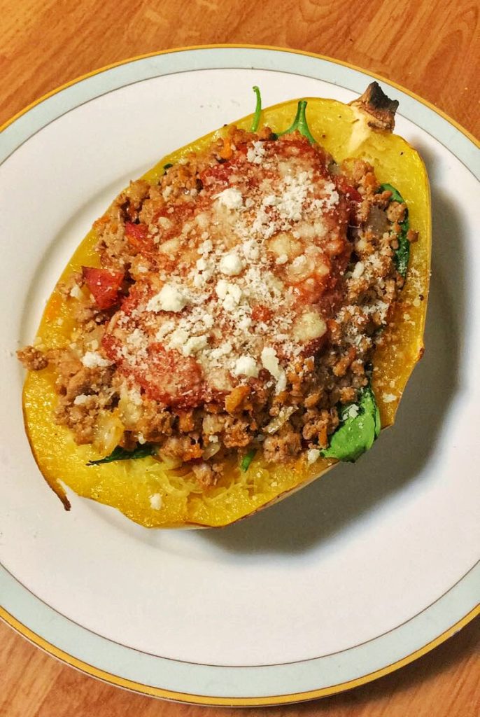 10. Place 1/2 cup spinach in each half of the spaghetti squash and pour the bolognese mixture on top. Add an additional 3 tablespoons of red sauce and sprinkle on parmesan cheese.